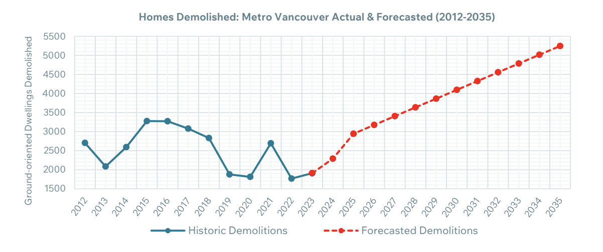 Auckland Council data shows that approximately 2,000–3,000 residential demolition consents (permits) are issued annually in the Auckland region. This is comparable to Metro Vancouver, where an average of 2,700 homes are demolished each year.