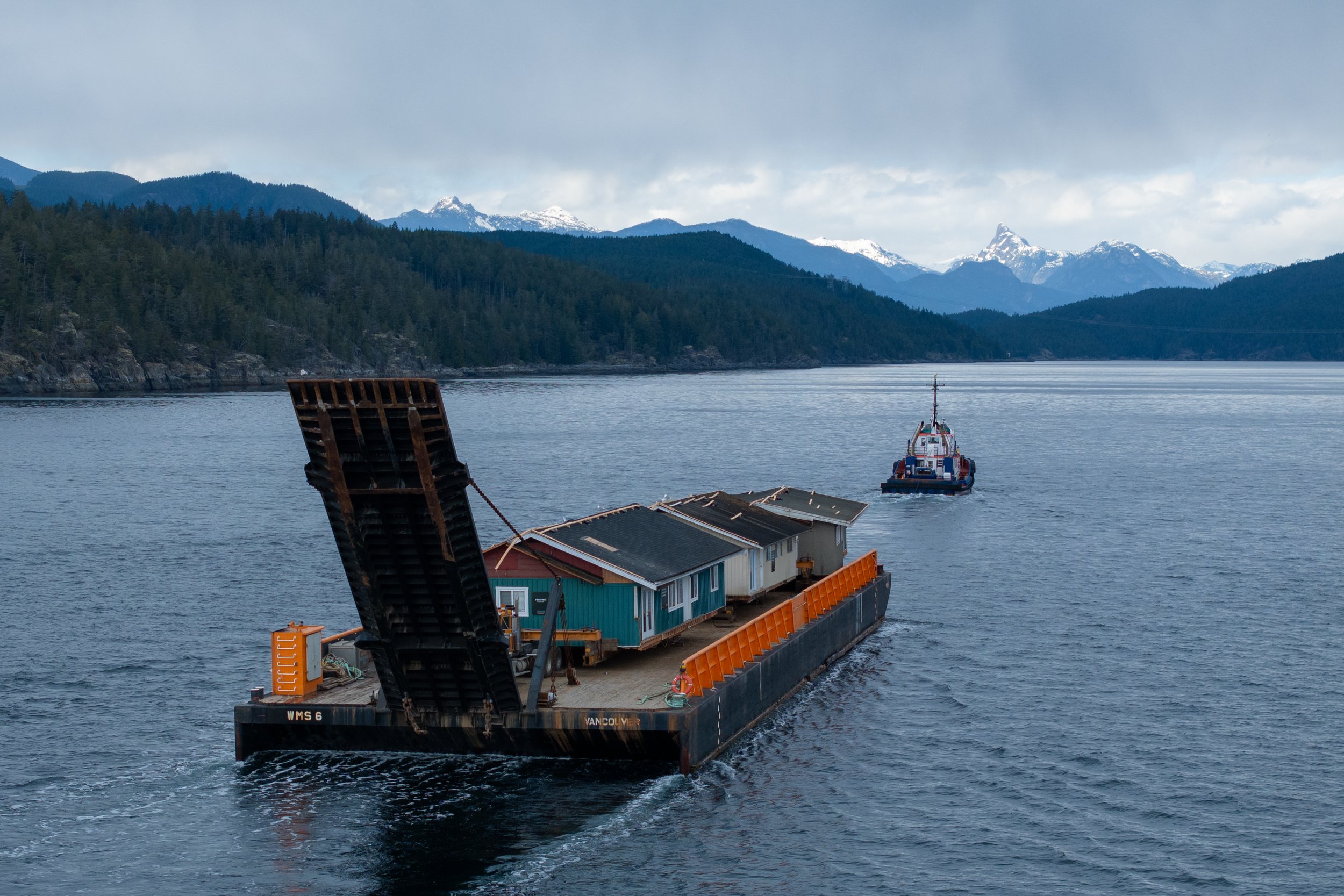 Above: Three homes rescued by Renewal Development are barged from Vancouver mainland to the shíshálh Nation on the Sunshine Coast.